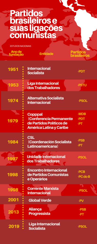 Pelo menos nove siglas partidárias participam formalmente de entidades comunistas mundiais que, junto do Foro de São Paulo, somam 12 órgãos declaradamente comunistas e de caráter internacionalista. Este foi o resultado de um levantamento feito por Renato Rabelo, membro da equipe de pesquisa e publicações da editora Estudos Nacionais. No passado, a subordinação internacional chegou a ser usada contra o PCdoB e a Constituição ainda veda a prática. Em 2015, com a nova Lei de Partidos Políticos, passou-se a permitir que o fundo partidário fosse destinado às internacionais partidárias, o que agravou a situação e pode ter ampliado o contingente de ativistas internacionais agindo no Brasil.