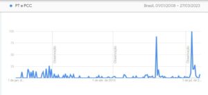 - A partir de 2014, a busca pelo PCC aumentou consideravelmente, chegando a superar a busca pelo PT em alguns momentos, como em 2017 e 2018.
