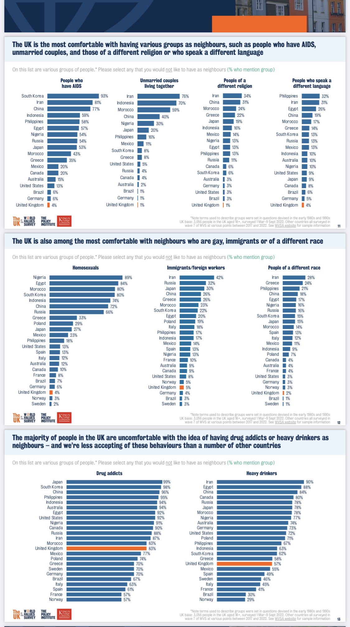 Tendo como base o Reino Unido, a pesquisa fez entrevistas em 24 países com a seguinte pergunta: “que tipo de pessoa você não gostaria de ter como vizinho?” Após a apresentação das alternativas, elaboradas entre grupos considerados mais discriminados, as respostas podem soar surpreendentes para quem está acostumado a ver frequente ativismo de minorias ditas imensamente discriminadas no país.